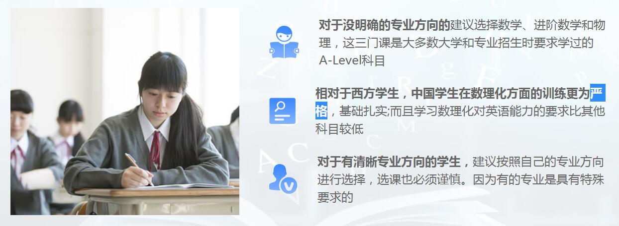 *注:因为中国、初中教育带来的优势,中国学生基本上都会报考数学,如果足够自信,还会报考进阶数学;另外可依据自己的喜好在物理、化学、经济、会计、生物、商科等课程中选择2-3门课程学习。
